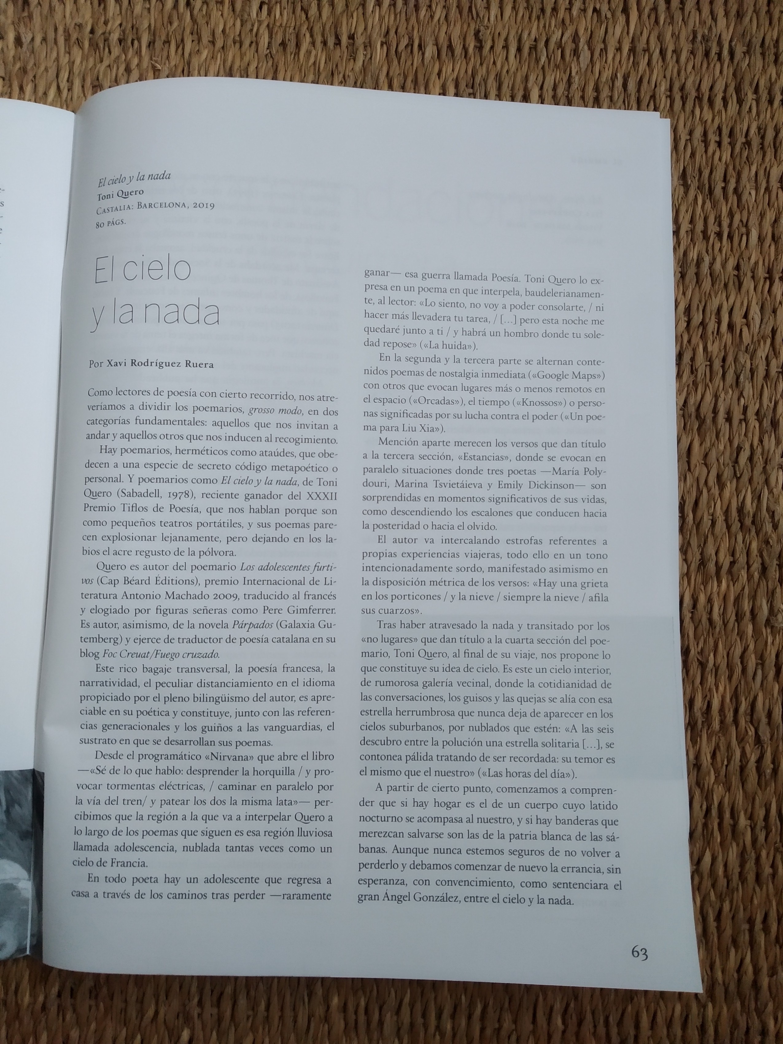 “En El cielo y la nada Toni Quero mantiene la pulsión tensional entre las incisiones autobiográficas del poema y el cauce reflexivo del lenguaje. Así toma cuerpo un diario especular, que profundiza en la trayectoria vital y en sus espacios imaginarios. El poema sondea, enuncia, escribe con imágenes de gran fuerza simbólica, y sigue el rastro de la decepción.» José Luis Morante