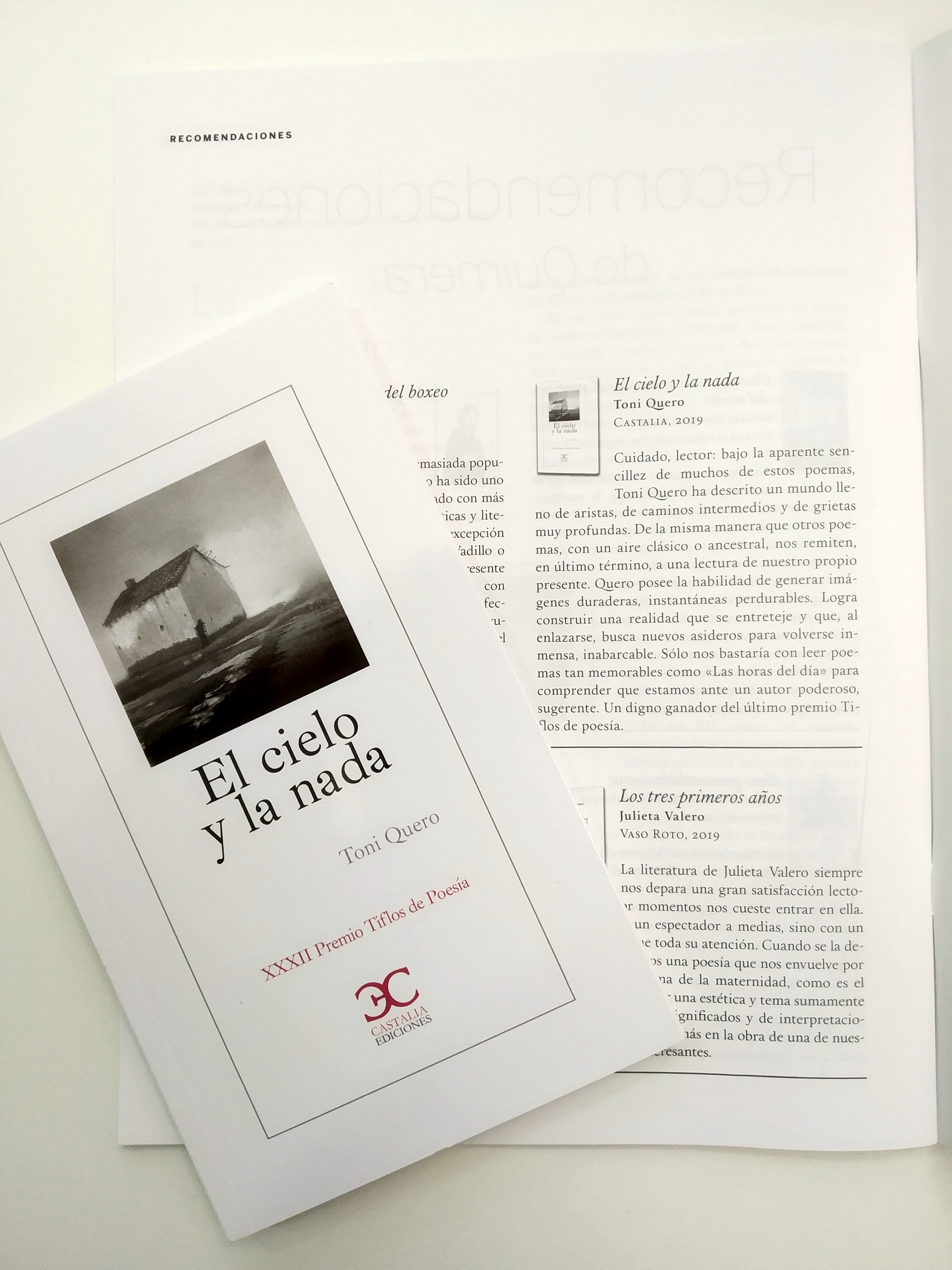 “En El cielo y la nada Toni Quero mantiene la pulsión tensional entre las incisiones autobiográficas del poema y el cauce reflexivo del lenguaje. Así toma cuerpo un diario especular, que profundiza en la trayectoria vital y en sus espacios imaginarios. El poema sondea, enuncia, escribe con imágenes de gran fuerza simbólica, y sigue el rastro de la decepción.» José Luis Morante